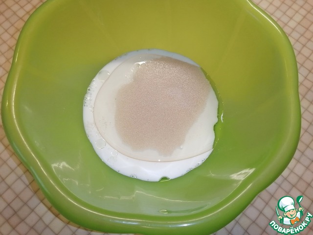 В глубокую миску налить тёплого молока. Влить подсолнечное масло.