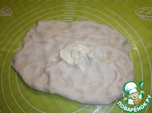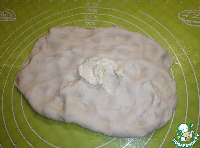 Нажимая кончиками пальцев немного растянуть тесто в лепешку. Сверху добавить кусочек мягкого сливочного масла и размазать по лепешке.