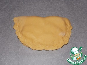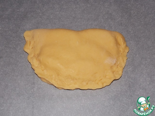 Сложить пополам и плотно защипнуть края. Выложить пирог на противень, застеленный пергаментом. Выпечь при 180С, примерно 20-25 минут.