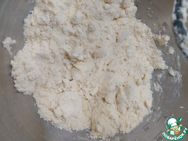 Для начала нужно приготовить тесто, потому что ему необходимо отдохнуть в холодильнике пару часов. В миске соберите муку (560 г) и три желтка. Следом добавьте рубленное холодное (можно ледяное) сливочное масло (300 г). Начните перетирать ингредиенты, как это делается для песочного или рубленного теста. Необходимо, чтобы масло измельчилось с сухими ингредиентами в крошку.