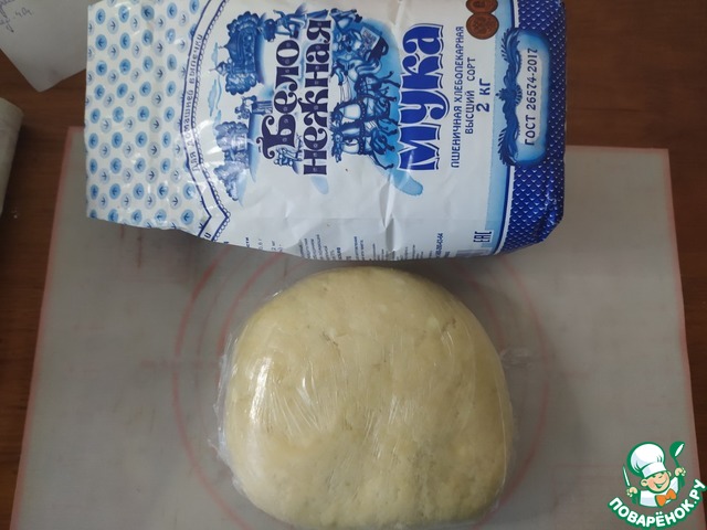 Вымешивайте до получения гладкого теста. Оно будет послушным и не липнущим к рукам (разве что совсем чуть-чуть). Муки больше не добавляйте. Оберните пищевой плёнкой и уберите в холодильник на 2 часа.