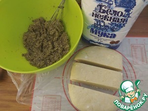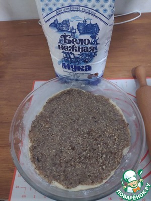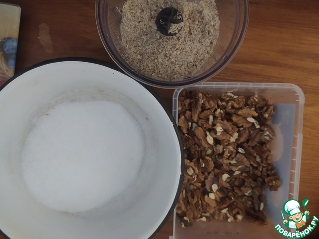 В это время можно подготовить начинку. Нужно порубить очень мелко сахар (300 г), грецкий орех (350 г, отложите 15-20 половинок) и кардамон (5 г). Чем сильнее порубите орех, тем нежнее будет начинка и наоборот.