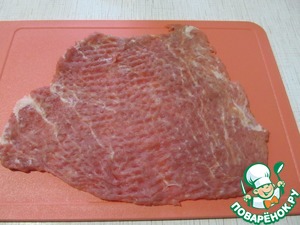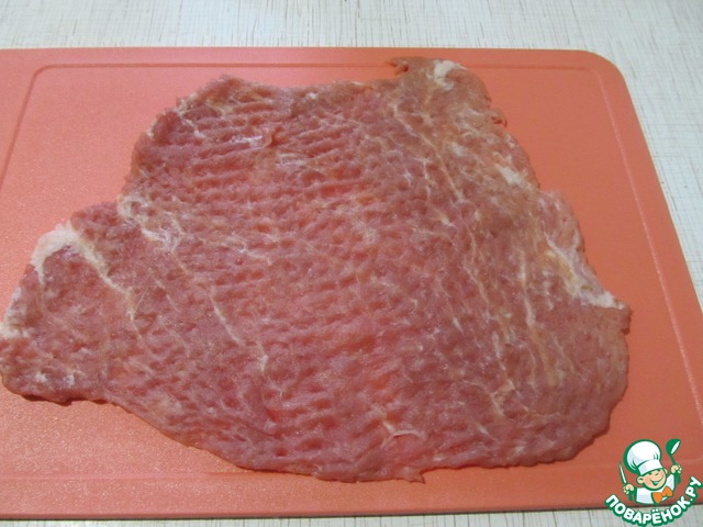 Свинину разрезать на тонкий пластины. Застелить пищевой пленкой и аккуратно отбить до однородной толщины.
