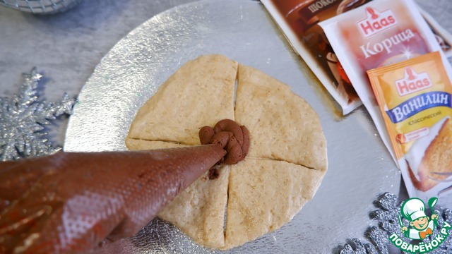 Разделить тесто на 10-12 частей. Сформировать шарики. Каждый шар раскатать в круг и надрезать на 4 части, как на фото.