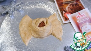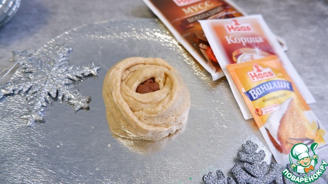 Четвертую часть обернуть вокруг начинки. Сформировать булочку. Выпекать 30-35 минут в разогретой до 180°С духовке.