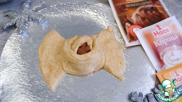 В центр положить начинку. Одну часть обернуть вокруг начинки.