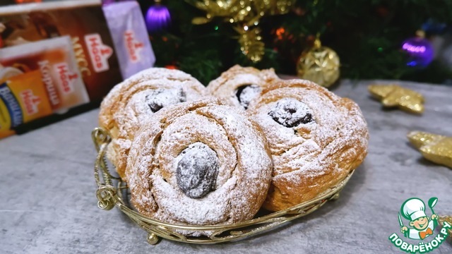Готовые булочки переложить в тарелку и украсить сахарной пудрой.