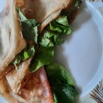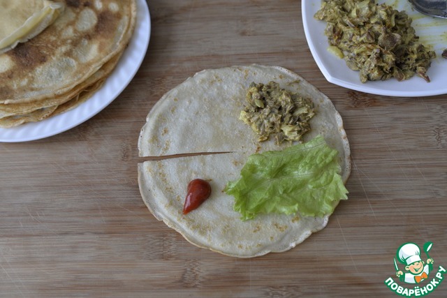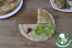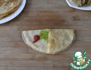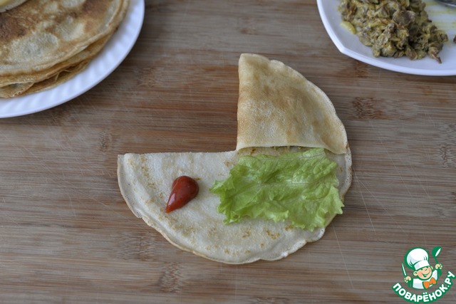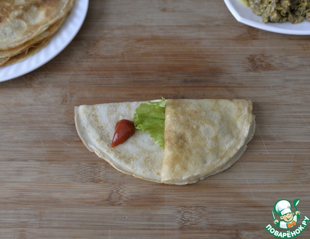 Мысленно делим блин на 4 части. Первую часть оставляем пустой. На вторую часть кладём 2 столовые ложки мясной начинки. На третью часть - кусочек листа салата (предварительно вымытого и обсушенного). На четвёртую часть - 1/2 ложки кетчупа. Если вы против кетчупа, то можете положить любой любимый соус, горчицу или майонез.
