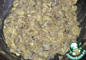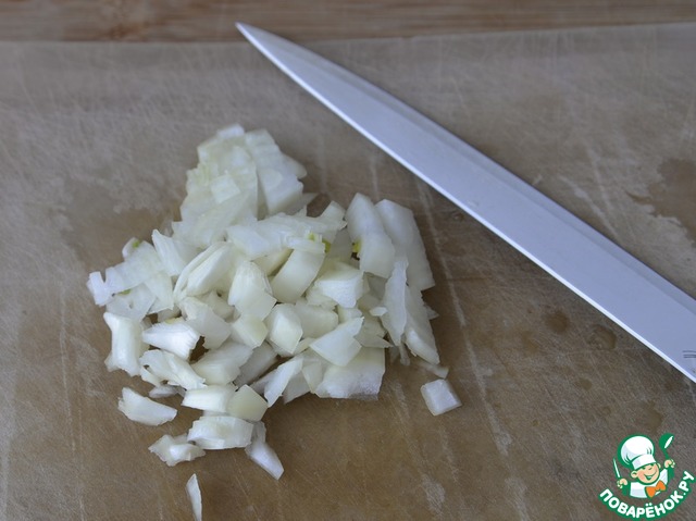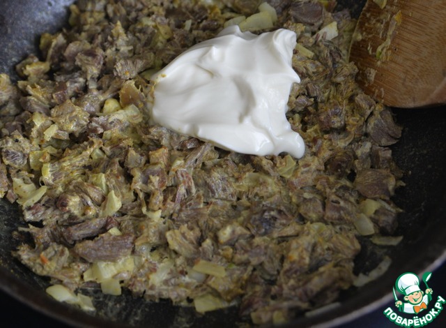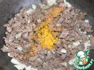 Обжариваем лук до мягкости на растительном масле, добавляем нарезанное мясо. Добавляем по вкусу соль, смесь перцев, куркуму. Не пересолите!