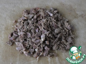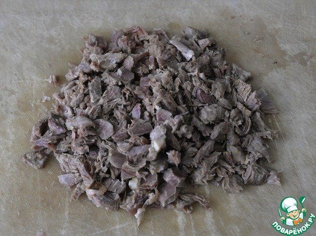 Берём любое вареное или запечённое мясо (или птицу), мелко режем.