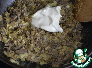Наливаем сливки, перемешиваем. Прогреваем мясо в сливках на слабом огне 5 минут.
