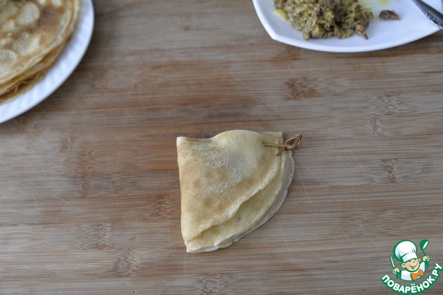 Пустой четвертинкой блина накрываем четвертинку с мясной начинкой.