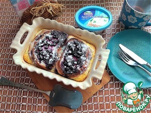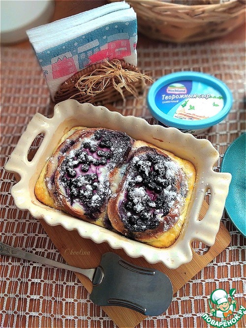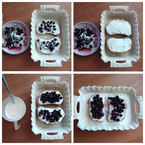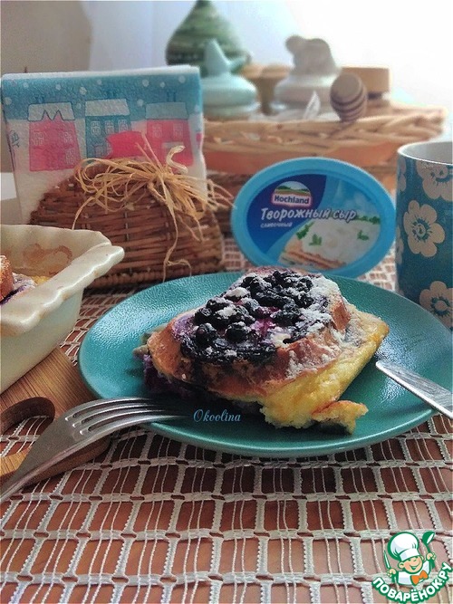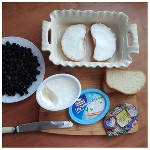 Почему почти? Потому, что я обмажу каждый кусочек хлеба творожным сыром, положу чернику замороженную и обвалянную сахарной пудрой. Хлеб вымачивать не буду в яично-молочной смеси, а просто залью содержимое формы.