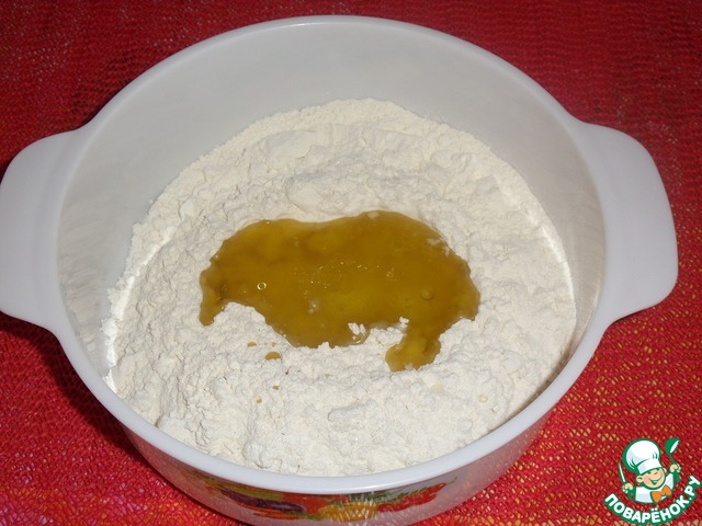 В чашку просеиваем муку. Добавляем щепотку соли, оливковое масло и холодную воду.