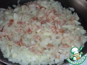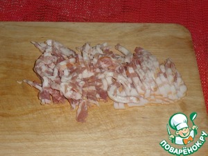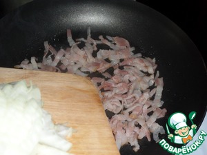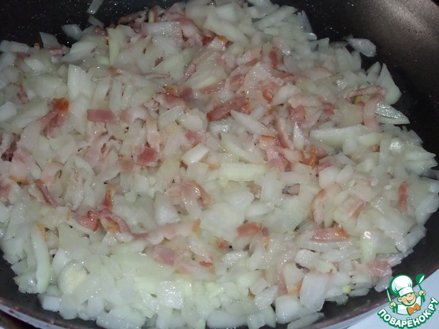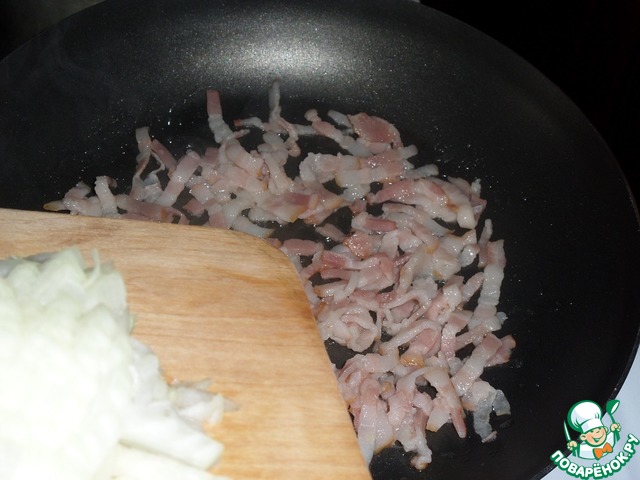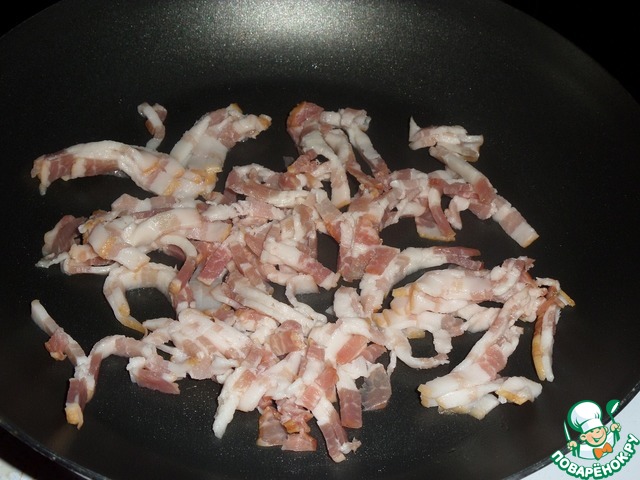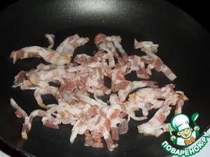 В разогретую сковороду выкладываем бекон и обжариваем 2 - 3 минуты.
