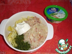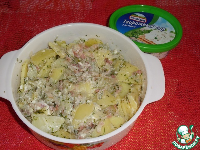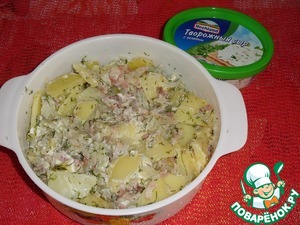 В чашку выкладываем нарезанный картофель, обжаренный бекон с луком, зелень, творожный сыр с зеленью ТМ "Hochland "и щепотку соли и черного молотого перца.