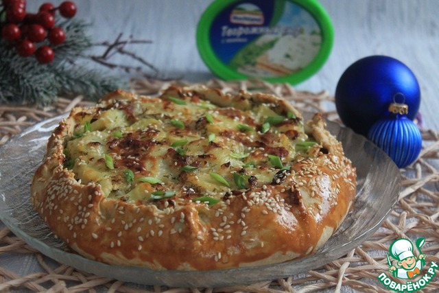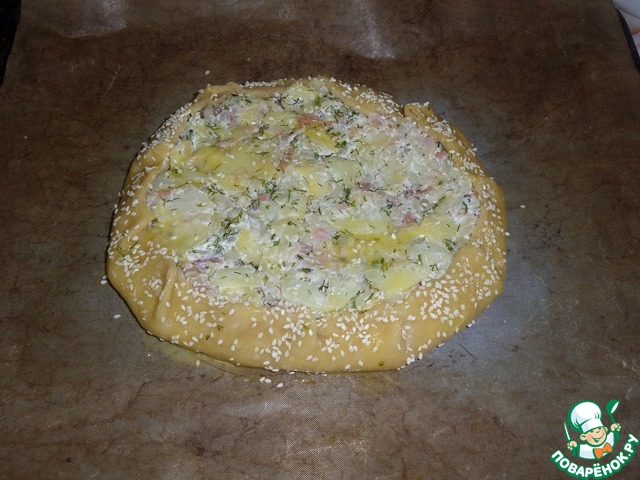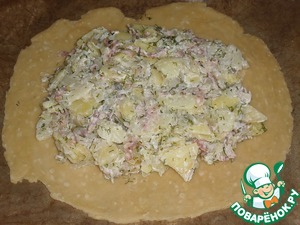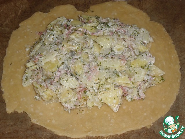 Края лепешки приподнимаем вверх и укладываем на начинку, делая небольшие защипы.