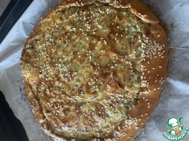 Смазываем пирог яичным желтком и посыпаем кунжутом.