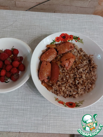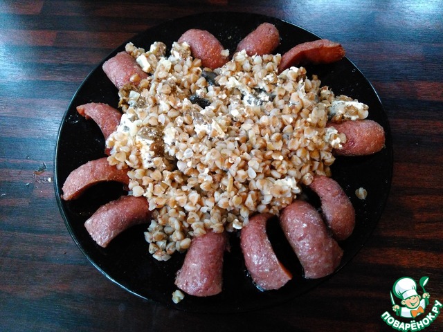 Кладем нашу гречку с сосисками и поливаем псевдо-подливкой тоже с сосисками))) в общем, масло масляное, а очень вкусно!