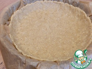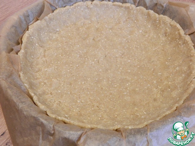 Форму застелим пергаментом, выложим тесто, утрамбовывая его, создадим бортики.
