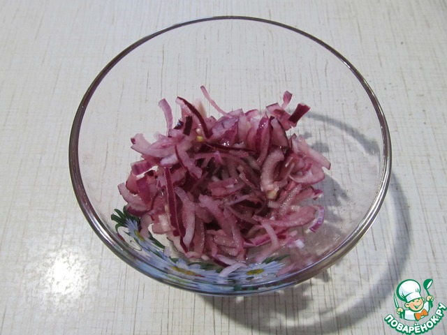 Красный лук нарезать полукольцами, ошпарить кипятком.