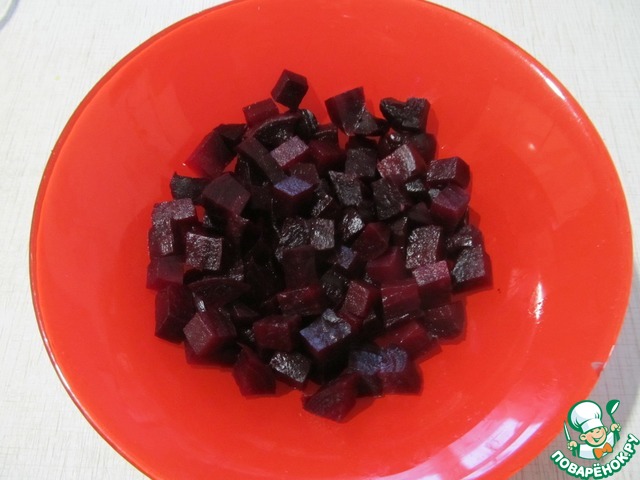 Отварную свеклу нарезать кубиками, сбрызнуть растительным маслом.