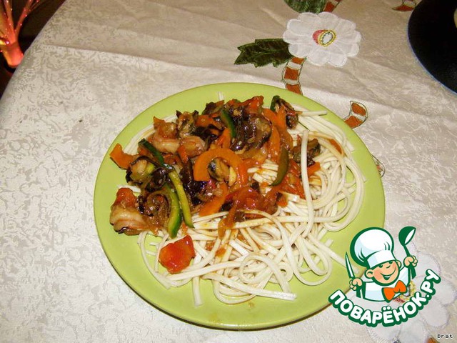 • Теперь можно вздохнуть, но не расслабляться, а подумать о гарнире, на стыковку с которым пойдет наше блюдо. Это может быть рис, а может быть рисовая, гречневая или пшеничная лапша быстрого приготовления. Например, такая.