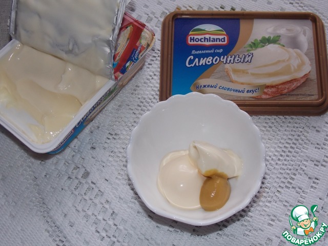 Приготовить соус. Смешать плавленый сыр Т. М. Хохланд с майонезом и горчицей до однородной массы.