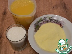 Приготовим продукты для крема. Это 60 грамм сахара, манная крупа и сок апельсиновый.