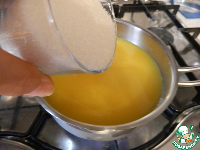 Поставим кастрюлю с соком на огонь, высыпем сахар.