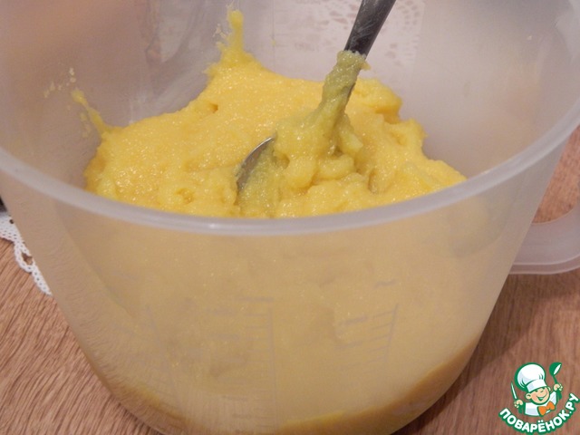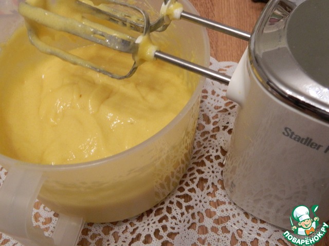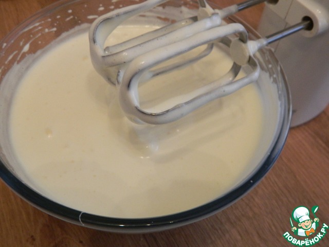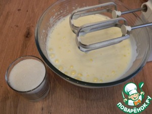 Выкладываем в высокую емкость и взбиваем миксером до посветления массы в течение 5 минут.