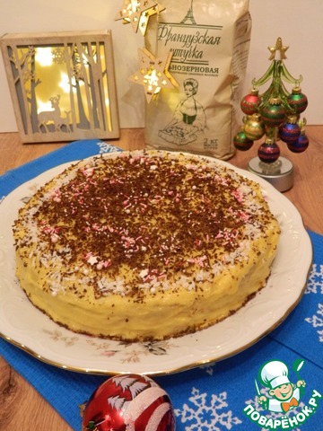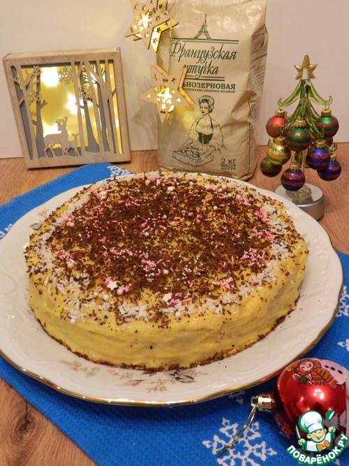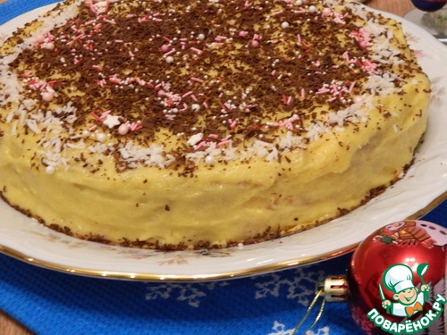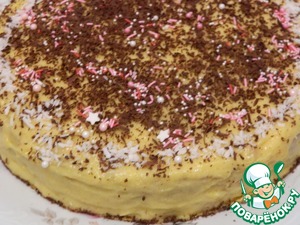 Украсим посыпкой кондитерской и кокосовой стружкой. Бисквит очень мягкий, нежный, дадим ему постоять пару часов потом разрежем.