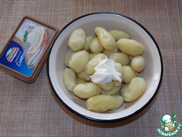 Картофель заранее отварить, очистить и остудить. Выложить в миску, добавить плавленый сыр.