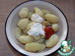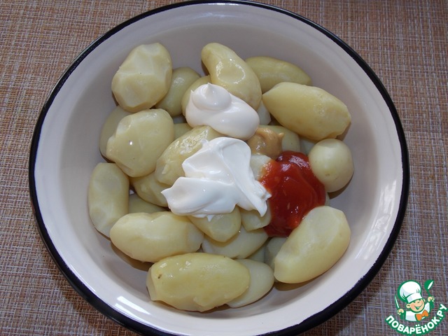 Добавить майонез и кетчуп. Кетчуп я использовала томатный, не острый.
