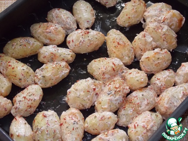 Форму для запекания смазать маслом. Выложить картофель. Запечь в предварительно разогретой духовке, при 180С, в течение 20 минут.