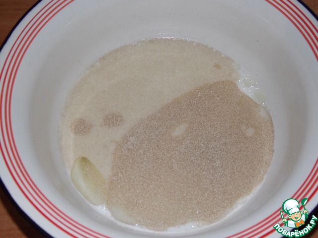 Для теста - в теплое молоко влить растительное масло. Добавить сахар и дрожжи. Перемешать, накрыть полотенцем и оставить на 10 минут.