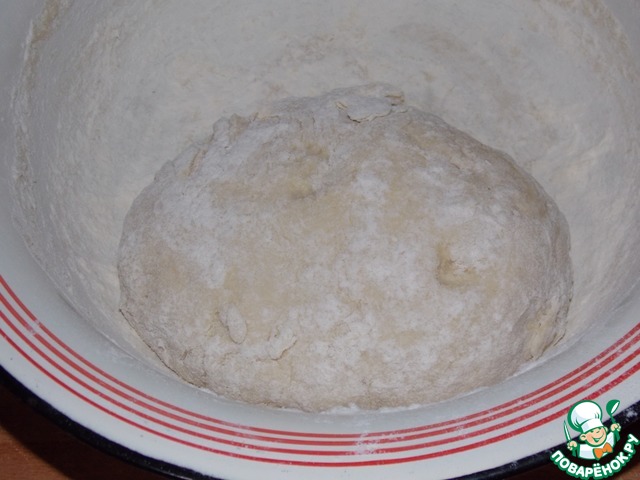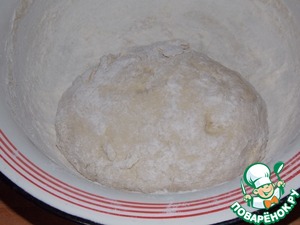 Всыпать постепенно муку. Муки может понадобится немного больше или меньше указанного количества. Готовое тесто не должно липнуть к рукам. Убрать миску с тестом в тепло на полчаса, накрыв полотенцем.