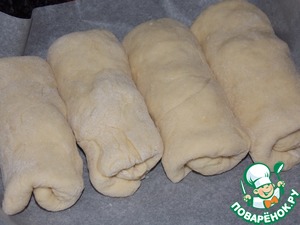 Раскатать каждую часть толщиной примерно 0,5 см. Выложить начинку, посыпать сахаром и свернуть рулетиками.