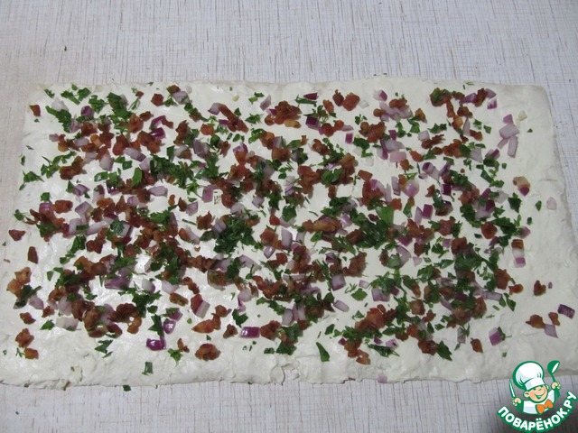 На смазанный лаваш равномерно распределить обжаренный бекон, красный лук и измельченную зелень.