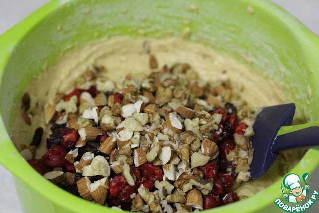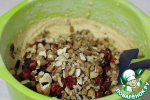 • Всыпать рубленые орехи и клюкву. Перемешать при помощью лопатки.