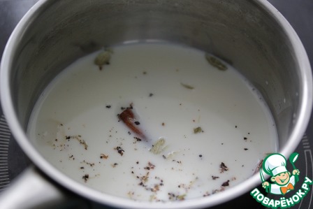 В кастрюльку влить молоко, добавить специи и имбирь, прогреть почти до кипения и готовить около 5 минут (кипеть не должно!).