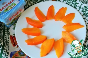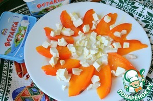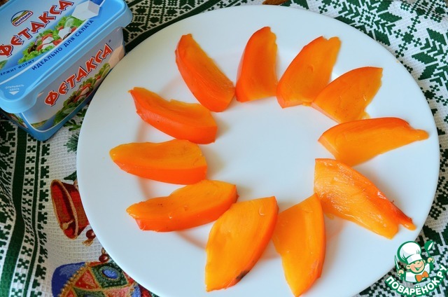 Фетаксу нарезать кубиком, 2/3 разложить к хурме, сбрызнуть оливковым маслом.