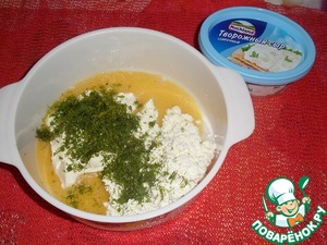 Затем в чашку добавляем творог, творожный сыр ТМ "Hochland " и нарезанную зелень. Хорошо перемешиваем.