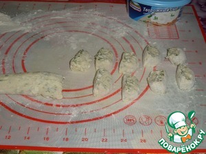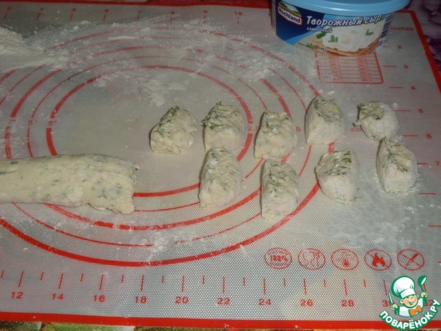 На коврик насыпаем муку и выкладываем тесто. Придаем тесту форму "колбаски" и нарезаем на кусочки.