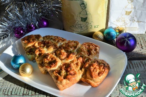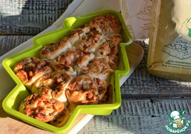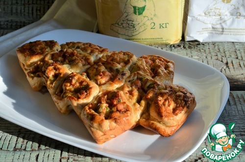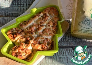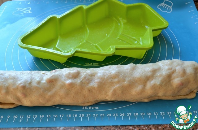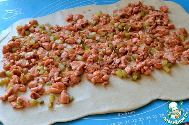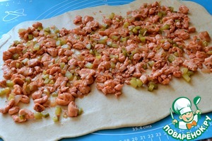 Выбродившее тесто обмять, раскатать в прямоугольник, 24*35 см.. Разложить на тесто начинку.