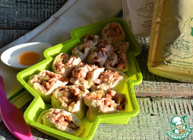 Приготовить начинку, для этого на растительном масле обжарить лук. Добавить кусочки курицы.