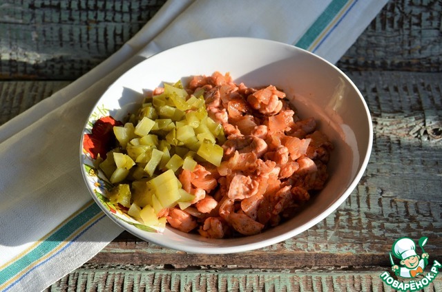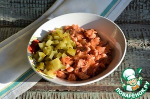Добавить паприку, довести до готовности. Добавить кубики маринованного огурца, перемешать. При необходимости посолить по вкусу.