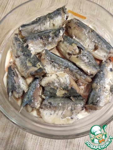 Выкладываем рыбку, у меня ставридка, но подойдут и другие рыбные консервы в масле (сельдь, скумбрия, горбуша, тунец).