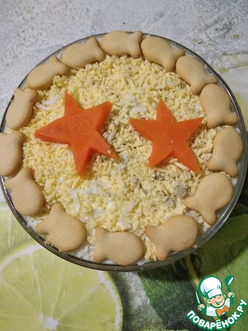 И последний слой - тертый желток, на который выкладываем для украшения крекер, или что вашей душе угодно. Приятного аппетита.