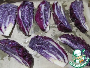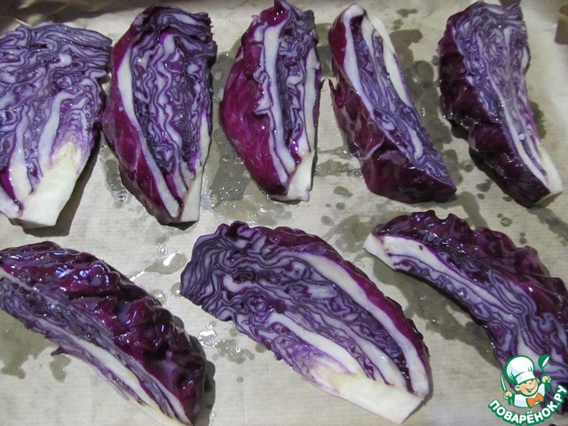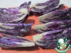 Краснокочанную капусту разрезать по кочерыжке на 8 частей.